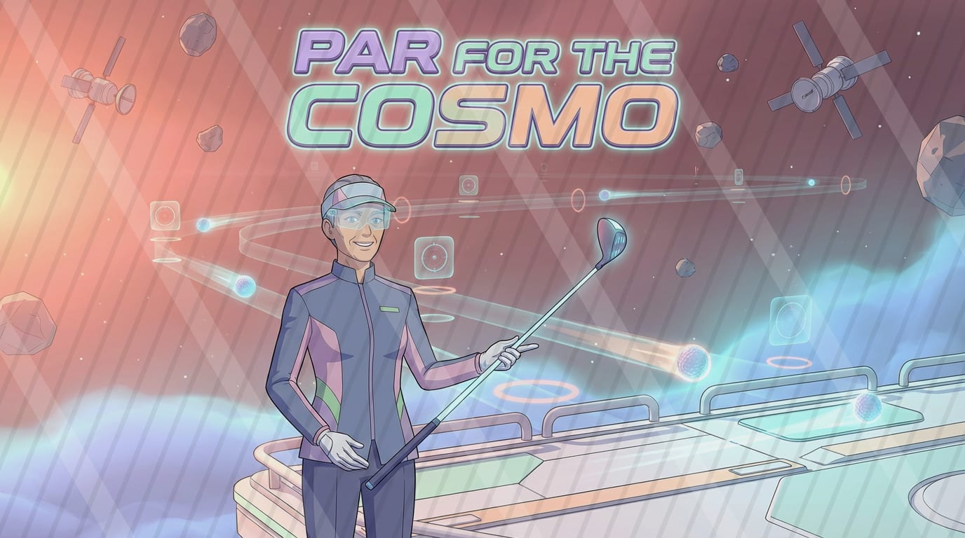 A pastel cel-shaded sci-fi driving-range slot where energy golf shots drift through a cozy nebula toward floating hologram targets.