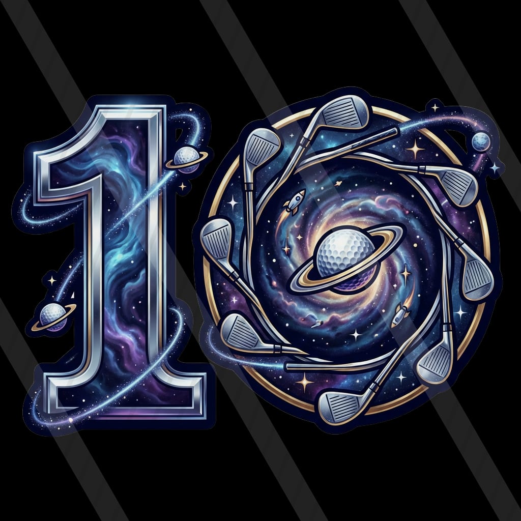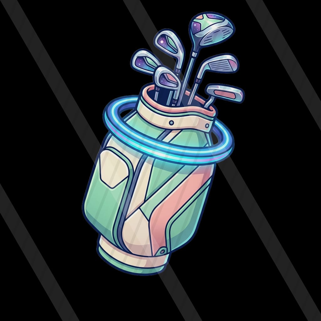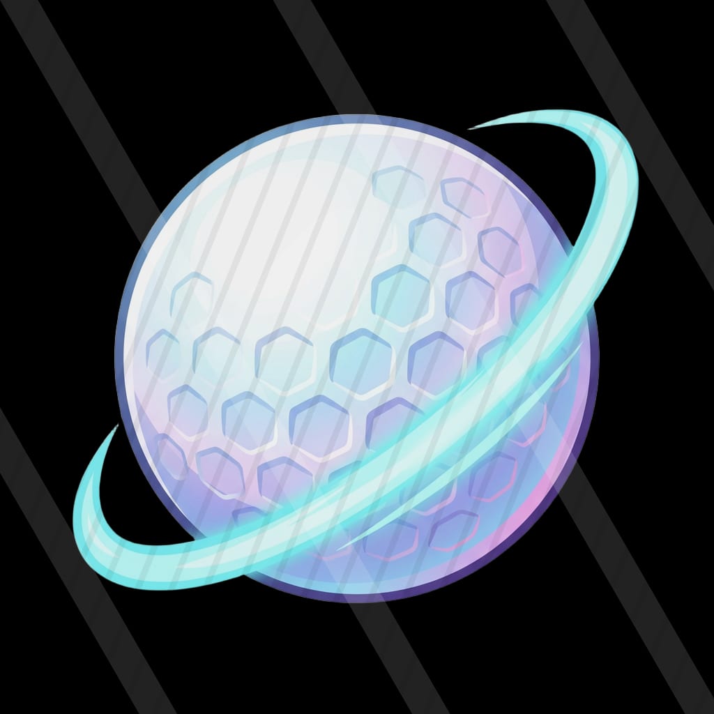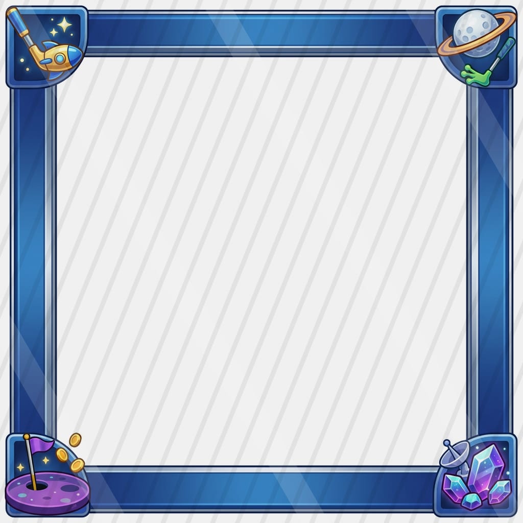 A pastel cel-shaded sci-fi driving-range slot where energy golf shots drift through a cozy nebula toward floating hologram targets.
